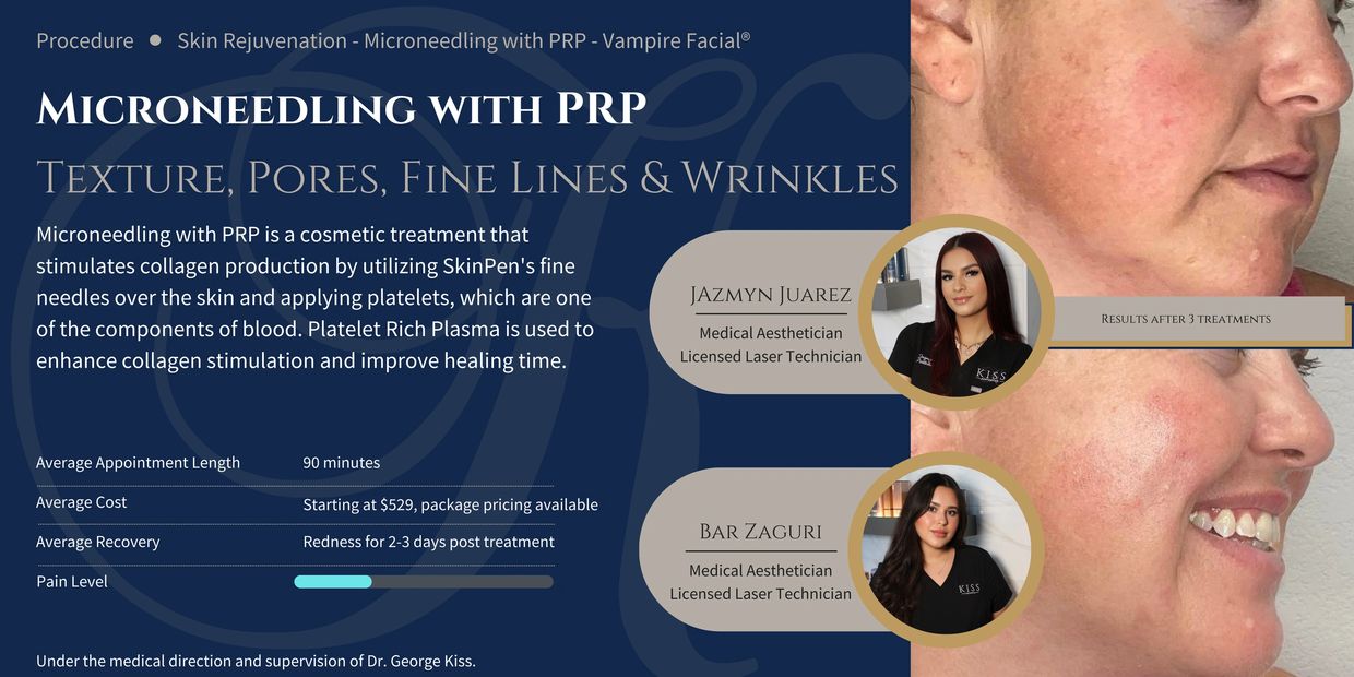 Microneedling with PRP, also known as a Vampire Facial®, is a cosmetic treatment used to address various skin conditions. The technique involves using a pen-like device comprised of micro sterile needles on the skin. When pressed on to the skin, it creates controlled, microscopic injuries, which stimulates collagen. While the micro-channels are open, platelet-rich plasma (PRP) is topically applied and pushed into the skin to further promote healing and enhance the anti-aging benefits. Treatable areas include the face, neck, décolletage, arms, abdomen, knees, chin, and any areas that have stretch marks or post-surgical scarring, although the most requested areas are face, neck, décolletage and hands.