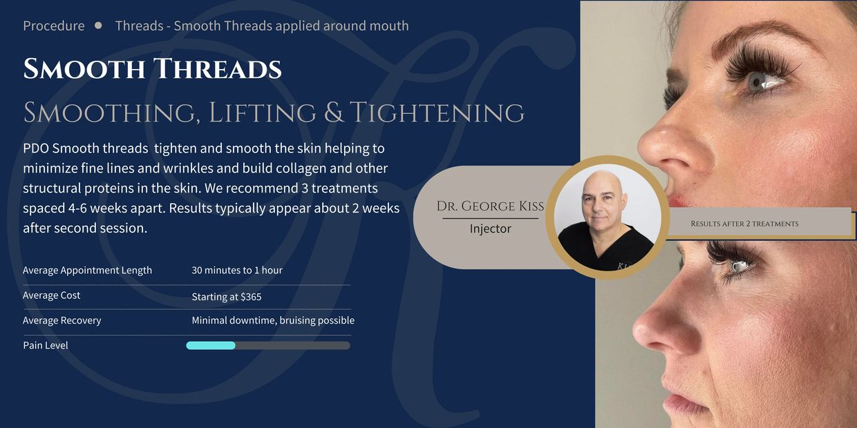 The benefits of smooth threads are the long-lasting skin enhancement results achieved with this treatment. However, patience is necessary when being treated with smooth threads, as results are gradual and noticeable after four weeks. The results then continue to improve for the life of the threads which is six months and lasts up to two years. Generally three treatments are recommended.